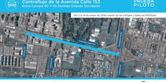 El contraflujo es un plan Piloto del Grupo de Gerentes de Área de la Dirección de Control y Vigilancia de la Secretaria de Movilidad que consiste en habilitar dos carriles en sentido Oriente - occidente, desde la carrera 50 hasta la carrera 55 con Avenida calle 153, en horarios de 17:00 hasta 20:00 de lunes a viernes iniciando el día 02 de mayo de 2018 y hasta el día 16 de mayo de 2018, este tendrá acompañamiento del Grupo Guía, de los profesionales de la Dirección de control y vigilancia de la Secretaria de Movilidad y de la Policía de Tránsito.